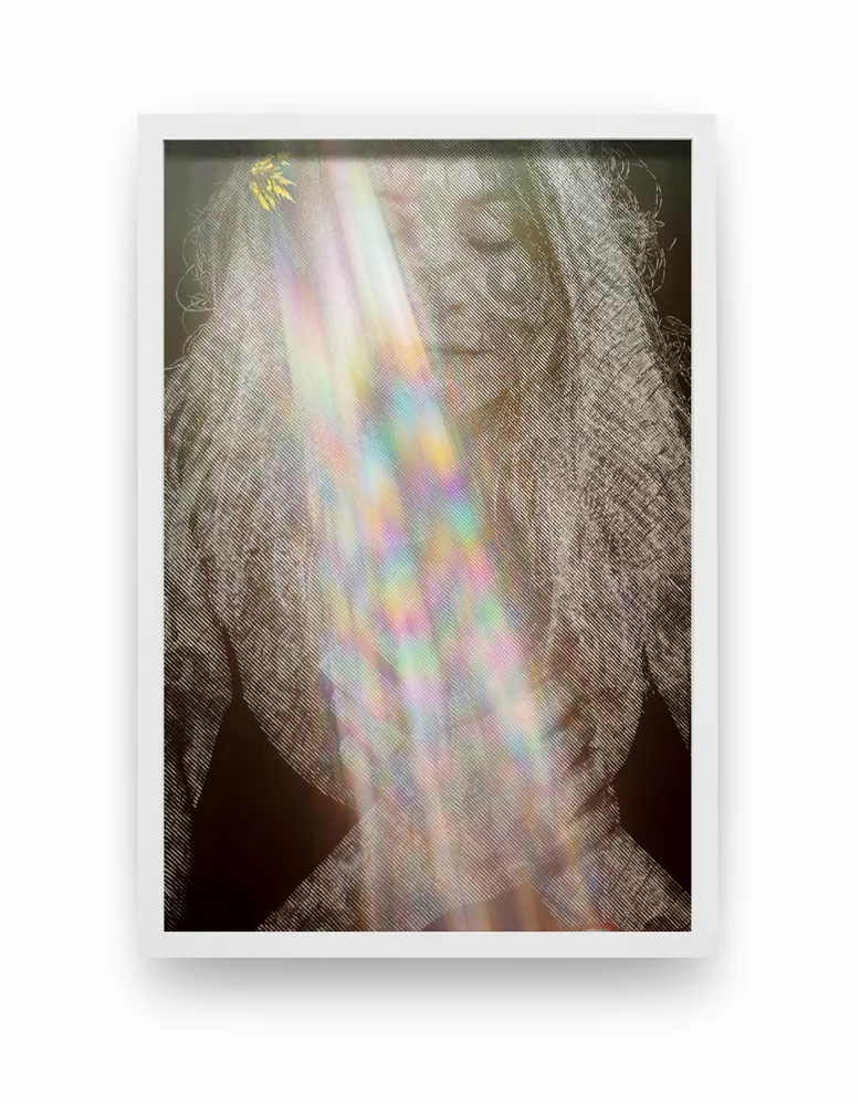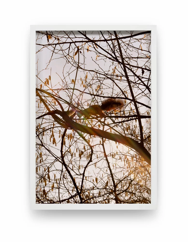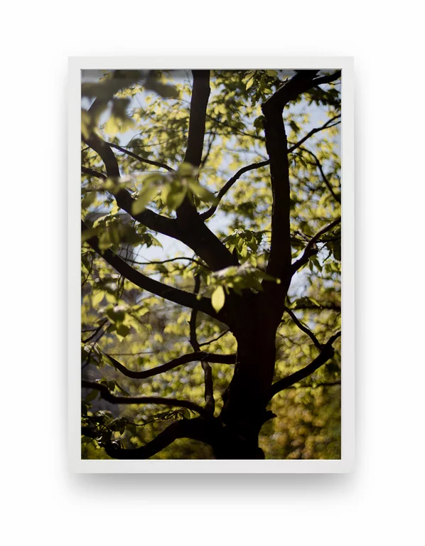 The only person who shows her face is a fairy – or is it a princess? Owing to a rainbow-like lens flare, the fairy-tale figure appears to be lost in other realms, behind a veil. Only this mysterious figure has a face. But are there other human elements? A close-up of the lower torso of a female sculpture, possibly in a park, public, confident, only this detail of a pelvis atop two long legs – although in reality it is not human at all, but rather a close-up of forking tree branches. A visual trap. Our yearning for life, for other people, causes us to see a human body where there is none.